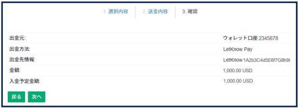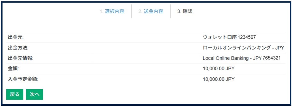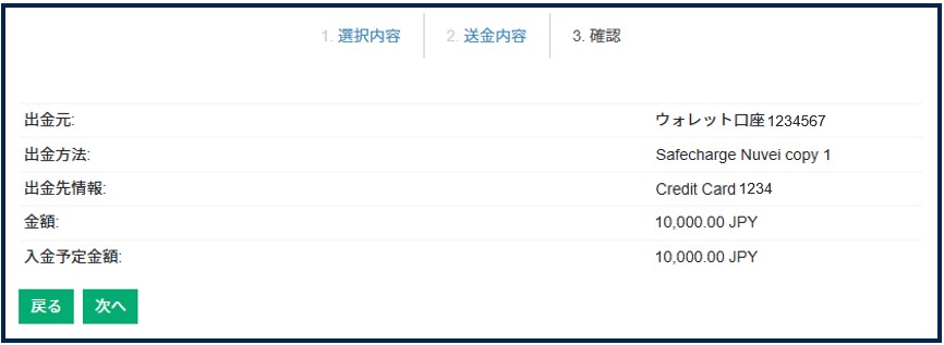 出金元口座、出金額、出金先のウォレットを確認のうえ、[次へ] をクリックしてください。