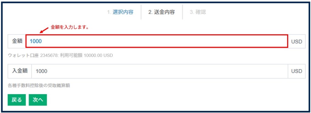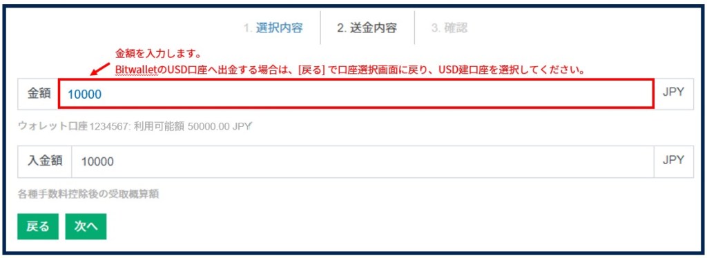上の [金額] 欄に出金額を入力してください。出金元をUSD建口座に指定した場合、下の [入金額] 欄もUSDで表示され、 Bitwalletへの送金もUSD建となります。
