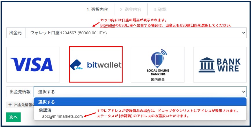 複数のウォレット・取引口座をお持ちの場合は、ドロップダウンリストから出金元となる口座を選択のうえ、赤枠で囲った [bitwallet] を選択してください。