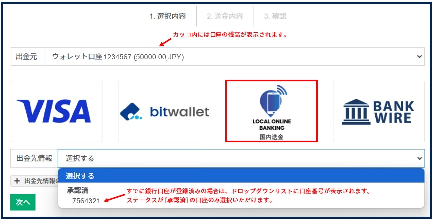 複数のウォレット・取引口座をお持ちの場合は、ドロップダウンリストから出金元となる口座を選択のうえ、赤枠で囲った [LOCAL ONLINE BANKING] を選択してください。