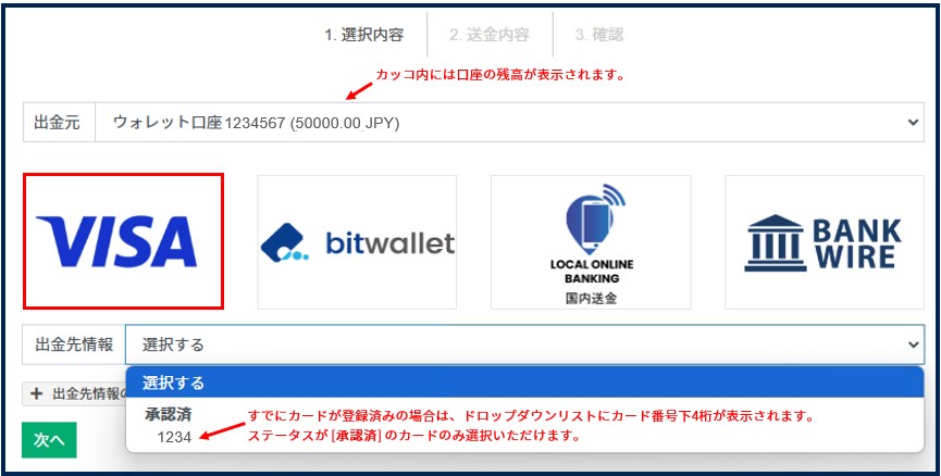 複数のウォレット・取引口座をお持ちの場合は、ドロップダウンリストから出金元となる口座を選択のうえ、赤枠で囲った [VISA] を選択してください。
