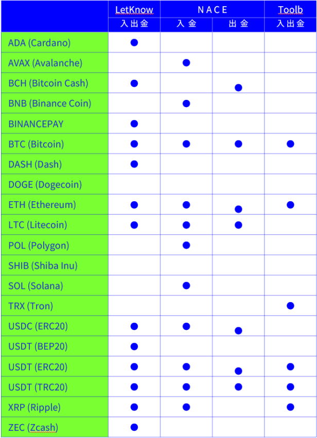 暗号資産は、サービスによりご利用いただける通貨が異なります。