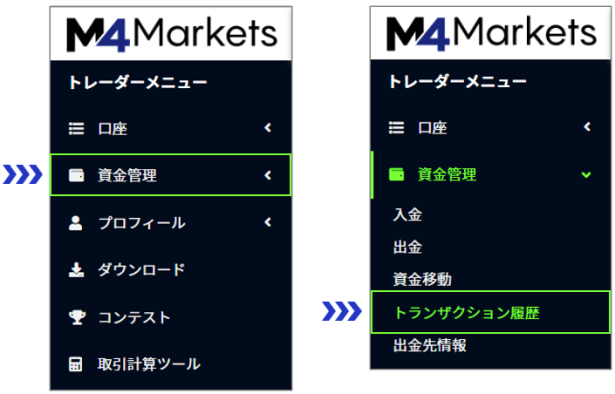 トレーダーメニューの [資金管理] ⇒ [トランザクション履歴] から履歴をご確認いただけます。