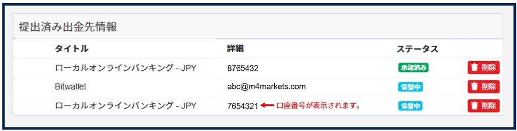 画面右の [提出済み出金先情報] 欄に振込情報が追加されステータスが 保留中となります。出金先情報が承認されるとご登録のメールアドレスに通知が送付されます。ステータスが、承認済みとなるまでお待ちください。