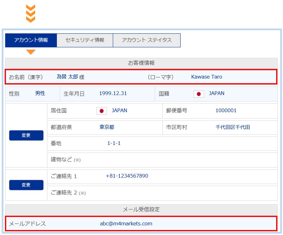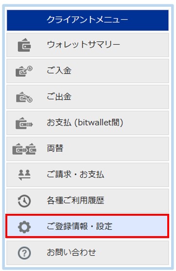 確認方法:Bitwalletにログインし、クライアントメニューの [ご登録情報・設定] 画面を開き、名前とメールアドレスが表示された画面のスクリーンショットを撮影してください。
