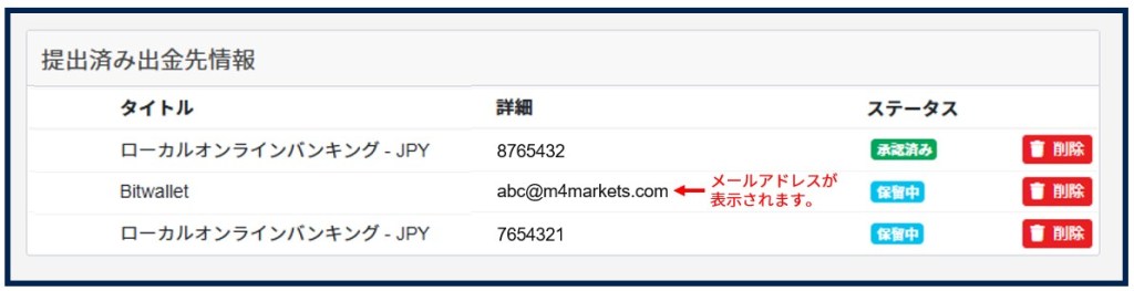 画面右の [提出済み出金先情報] 欄にビットウォレットの口座情報が追加されステータスが 保留中となります。出金先情報が承認されるとご登録のメールアドレスに通知が送付されます。ステータスが、承認済みとなるまでお待ちください。