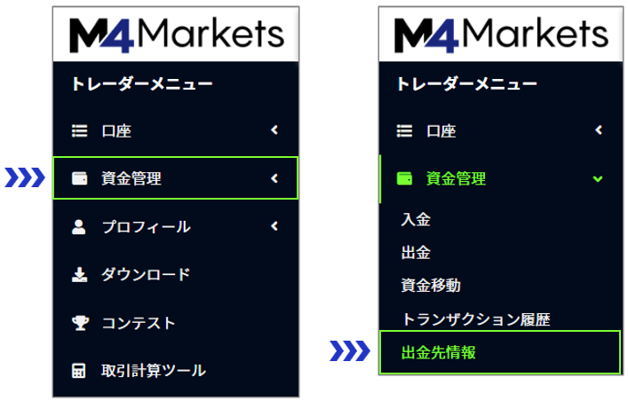 トレーダーメニューの [資金管理] ⇒ [出金先情報] を選択します。