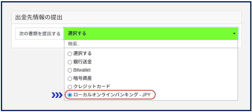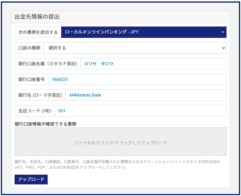 [次の資料を提出する] のドロップダウンリストから [ローカルオンラインバンキング – JPY] を選択すると入力画面が表示されます。