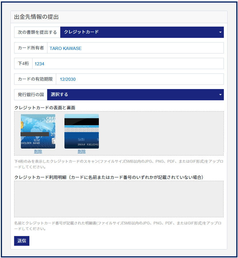| カードの表面と裏面 | 名前とカード番号の下4桁が表示されたカードの表面と裏面、2つの画像をアップロードしてください。セキュリティ対策のため、下4桁以外はカバーしてください。 |