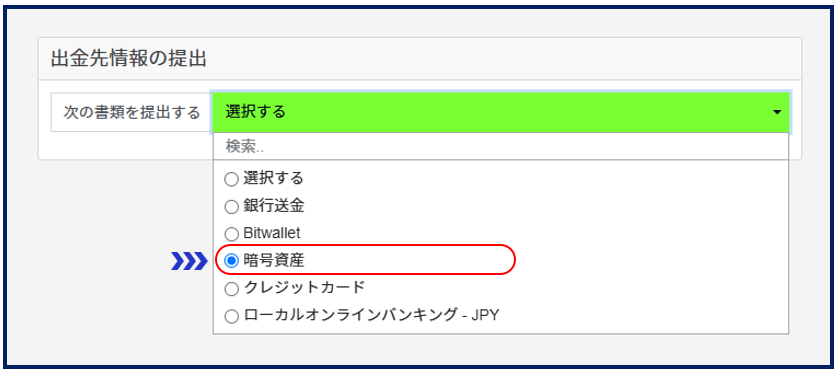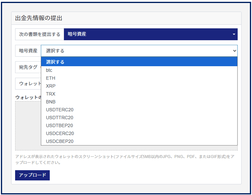 [次の資料を提出する] のドロップダウンリストから [暗号資産] を選択すると入力画面が表示されます。